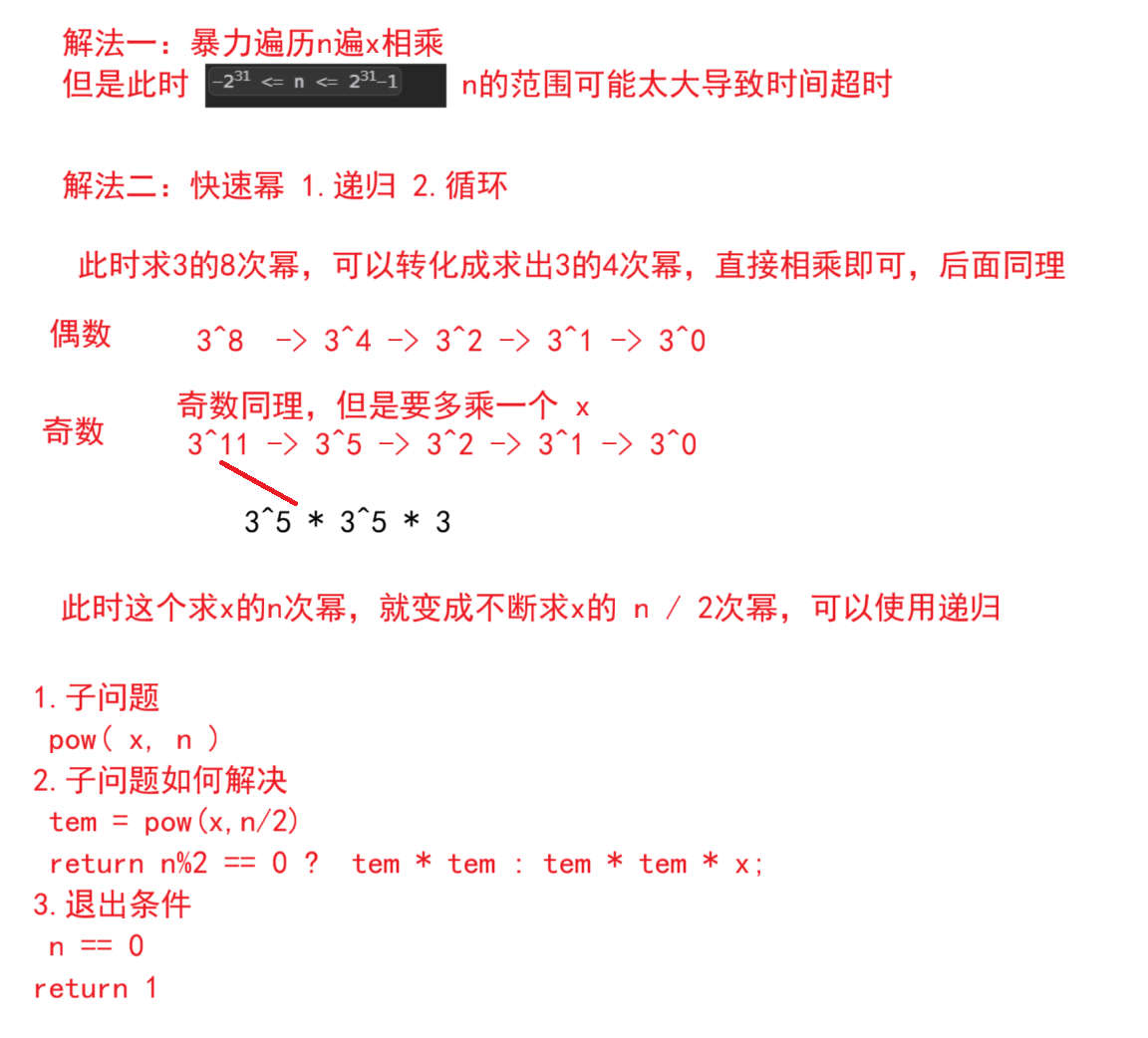 题目解析:就是求出x^n,求出x的n次幂,此时如果直接遍历可能会超时,因此这里采用快速幂的思想