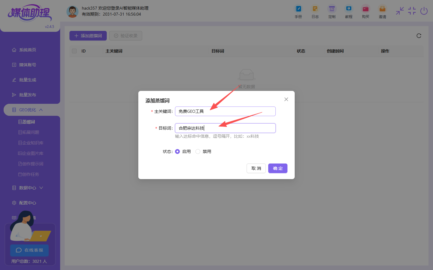 举个例子下面图片中我写的是免费GEO工具主词,目标词是合肥宗达科技