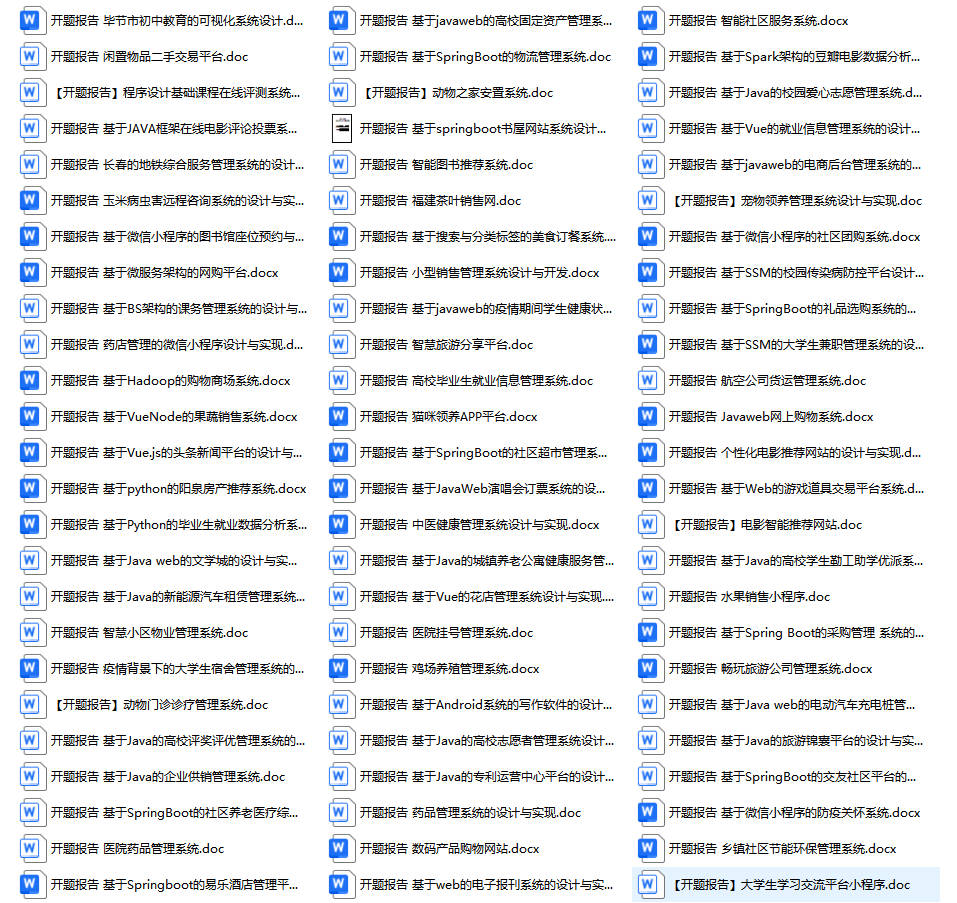 以上是某同学的毕业设计答辩的过程,如果你现在还没有参加答辩,还是开题阶段,已经选好了题目不知道怎么写开题报告,可以下面找找有没有自己符合自己题目的开题报告内容,列表中的开题报告都是往届真实的开题报告,可发送使用或参考。文末或底部来联xi可免费获取