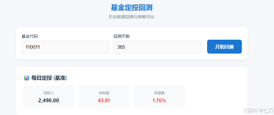 本系统通过简练的代码实现了一个功能完整的量化回测工具。它展示了如何将后端的数据处理能力与前端的交互体验相结合,解决实际生活中的投资决策问题。