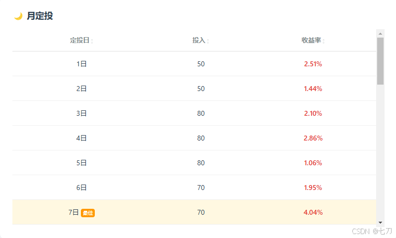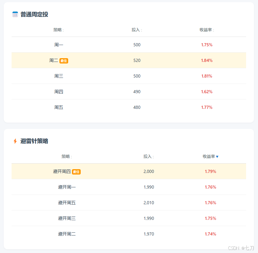 - 比较:使用 array_column 和 max 函数找出数组中的最大收益率,并在前端渲染时进行比对。