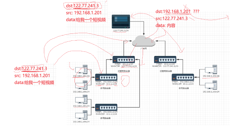 那么最后交给公网中目标主机的报文中发送地址就变为了运营商路由器的公网IP地址,那么当对端主机处理完请求后,就会将运营商路由器的公网IP作为目的地,从而成功将应答报文交给了运营商路由器。