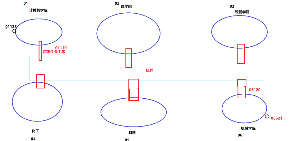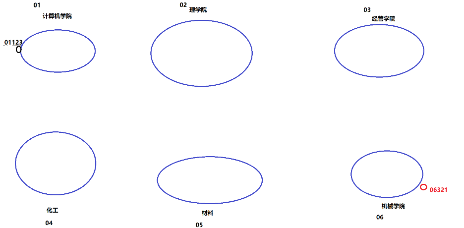 现在一所学校分为上图的6个学院,学校根据学院的不同设计了不同的学号,就如计算机学院的学生学号前面两位都是01,机械学院的学生前面两位都是06。