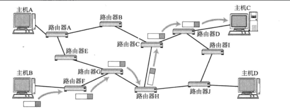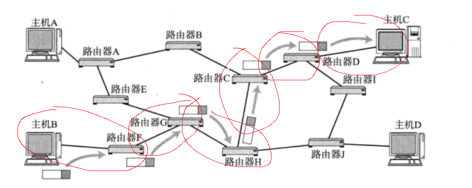 这里我们先提前渗透一下,当主机B要给主机C传递消息时,主机B会先将消息发送给路由器F,路由器F再将消息发送给路由器G,以此类推,通过一条完整的路径最终将消息送到主机C的手中,这种方式叫做路由。