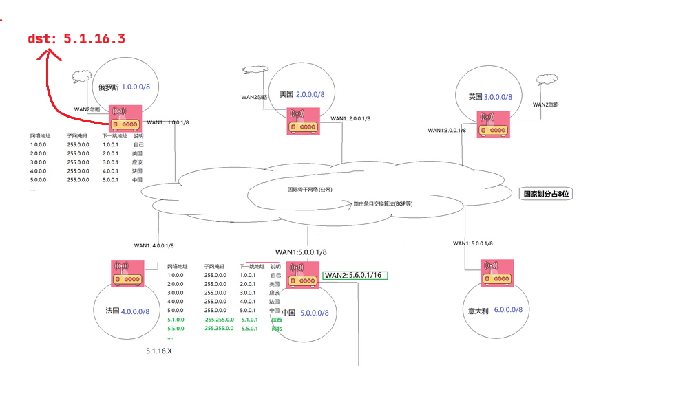 比如现在俄罗斯的国际路由器要访问IP地址为:5.1.16.3,那么这个信息是如何到达目的地的呢?