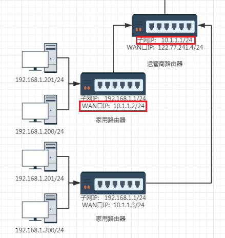 其实到这一层市间路由器相当于运营商路由器了,它下面就是我们各个家庭的子网了,而这不就相当于第三次网络划分吗?