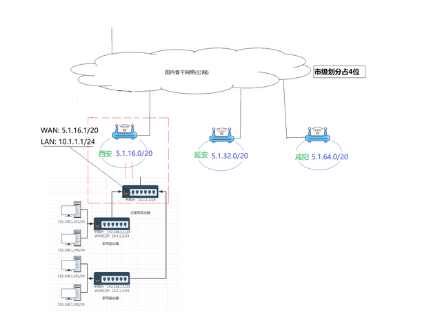 在省之下还有市级别,在前面划分了国家,省份的网络号后,市级划分再占4位,相当于前20位为网路号,就如:西安市的前缀就是5.1.16,延安市的前缀就是5.1.32,并且通过这些市级别的路由器也同样构成了我们国内的骨干网络(公网)。