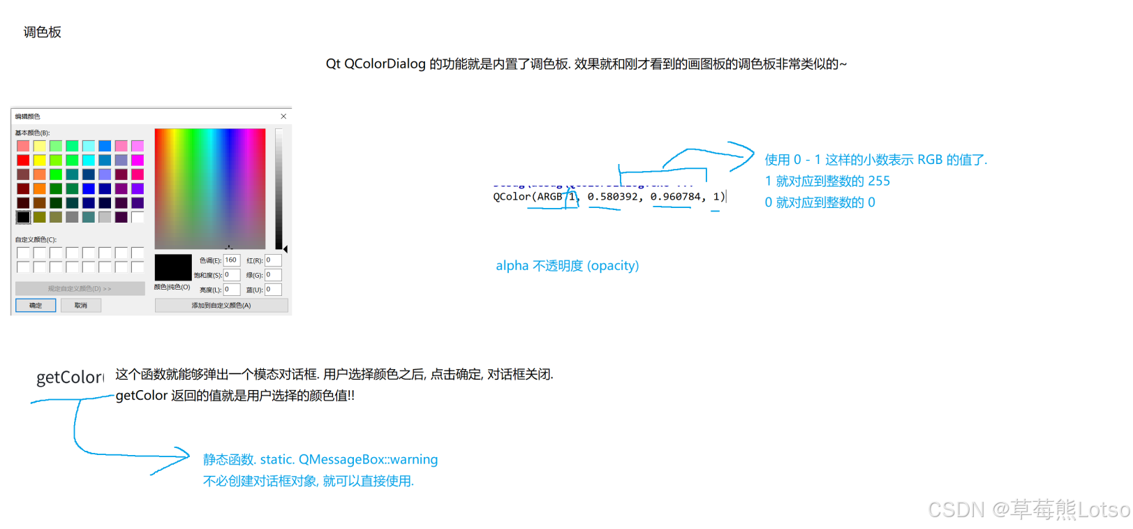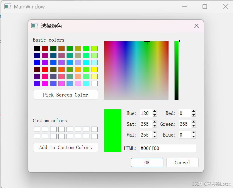 QColorDialog 用于让用户选择颜色,支持基础颜色、自定义颜色、屏幕取色,返回 QColor 对象(包含 RGB、HSV 等颜色信息)。