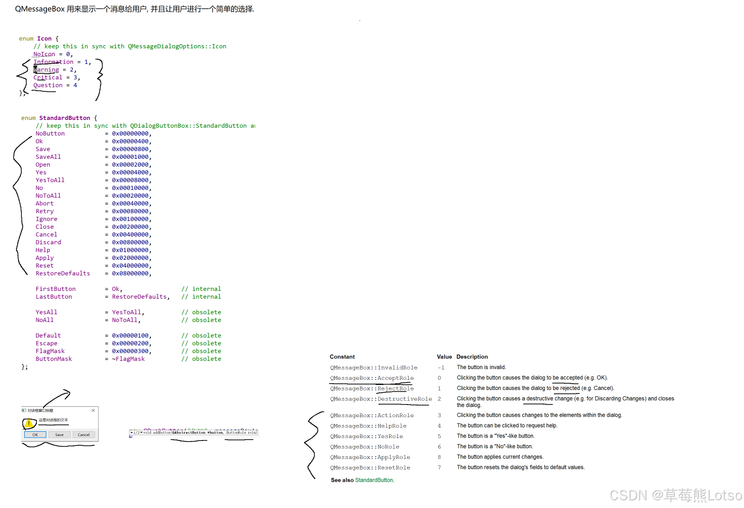 QMessageBox::StandardButton枚举指定(如Ok、Cancel、Yes、No); - 静态方法直接返回用户选择的按钮,无需手动绑定信号槽;