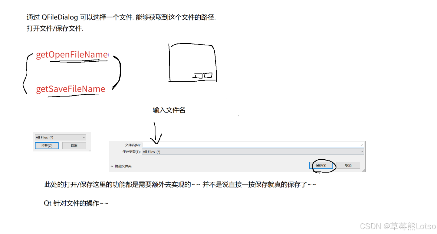 getOpenFileName():打开单个文件,返回文件路径字符串;getOpenFileNames():打开多个文件,返回文件路径字符串列表;getSaveFileName():保存文件,返回保存路径字符串;- 关键参数 :