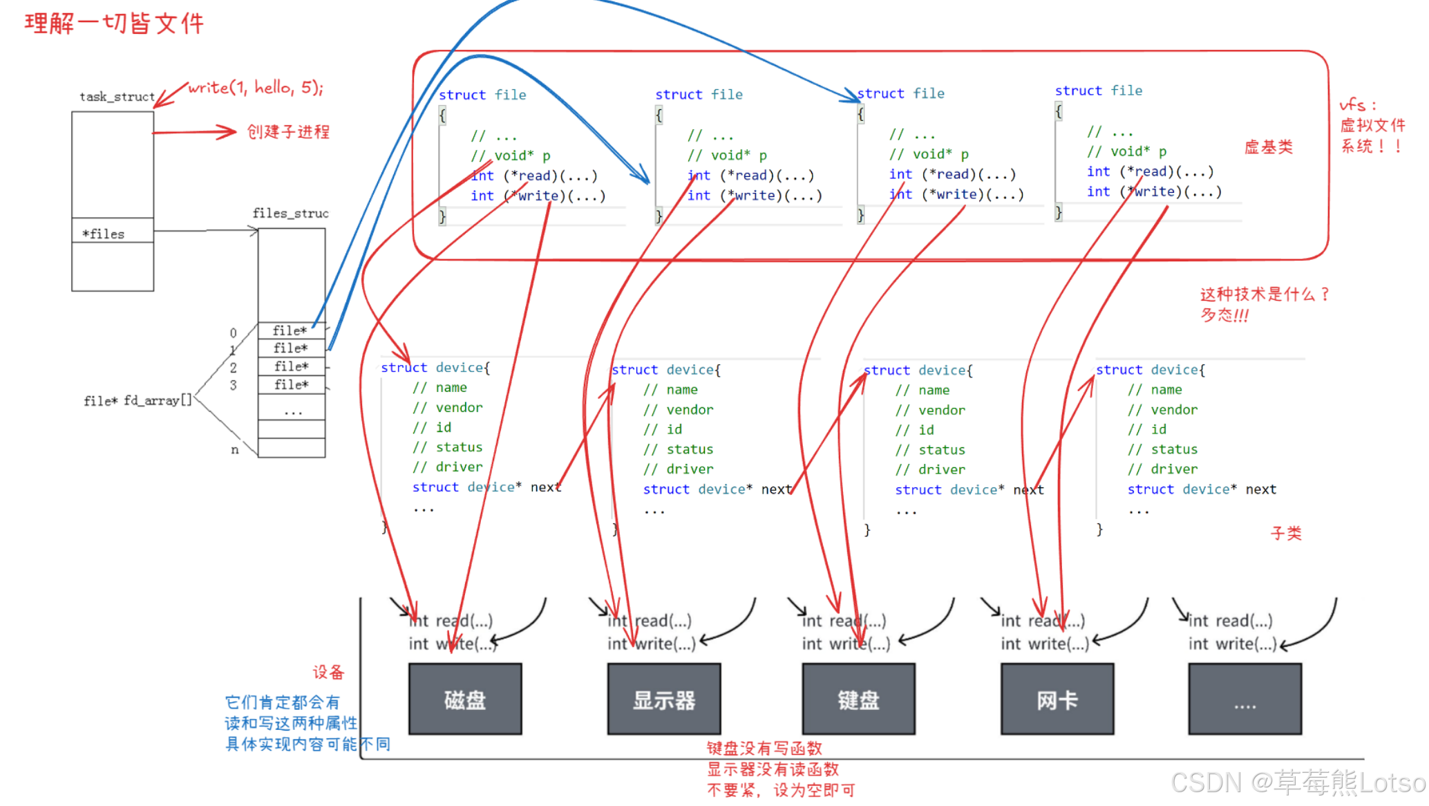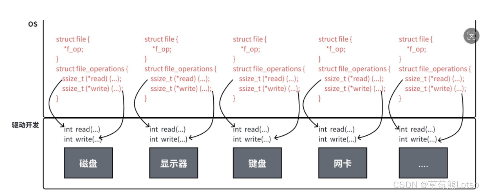 上图中的外设,每个设备都可以有自己的read、write,但⼀定是对应着不同的操作方法!!但通过struct file 下 file_operation 中的各种函数回调,让我们开发者只用file便可调取 Linux 系统中绝大部分的资源!!这便是"linux下⼀切皆文件"的核心理解。