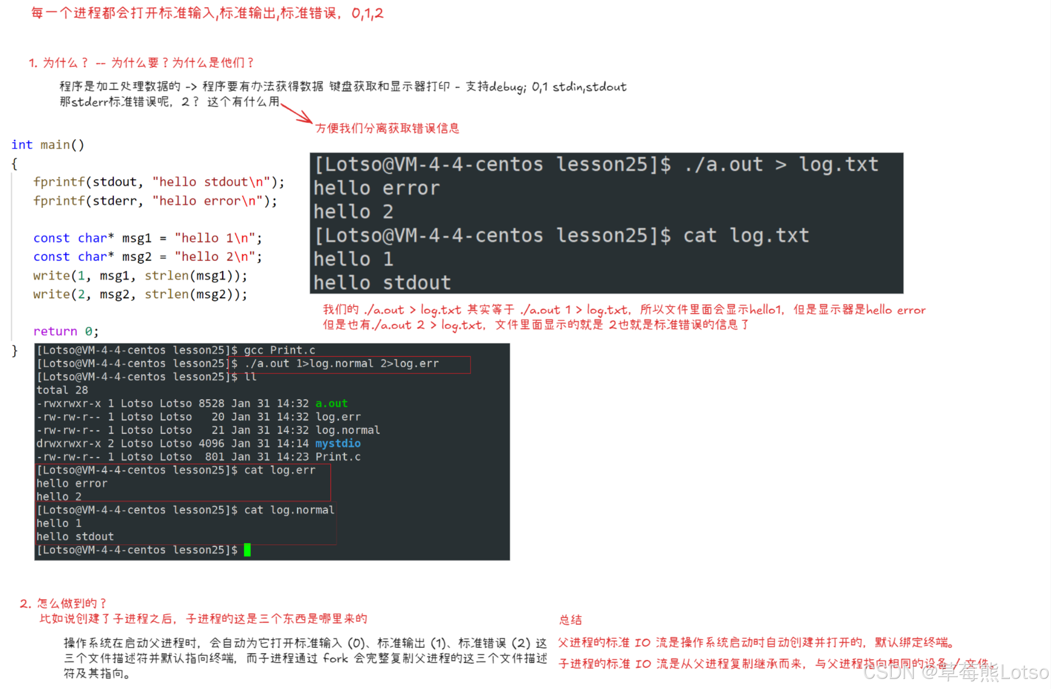 - 缓冲区与重定向 :stdout 默认是行缓冲(输出到终端),重定向到文件后变为全缓冲,需注意