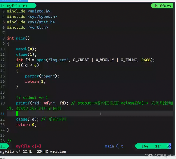 - 解析:这是因为 printf 写入的是用户态缓冲区,而 close(fd) 直接关闭了内核中的文件描述符,导致程序退出时缓冲区数据无法刷新到已关闭的文件中。