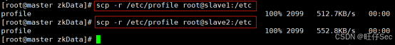 由于已配置 SSH 免密登录,可使用 scp 命令将整个 zookeeper 目录和环境变量文件分发到 slave1 和 slave2:
