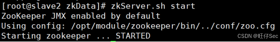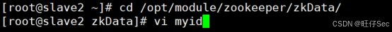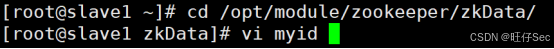 slave1,将myid内容改为2:bash[root@slave1 ~]# echo 2 > /opt/module/zookeeper/zkData/myid