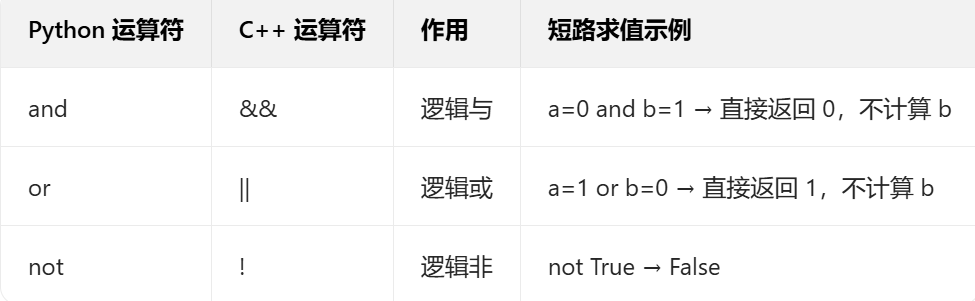pow)或循环实现 Python 的便捷功能; - 逻辑运算符 Python 用英文单词(and/or/not),C++ 用符号(&&/||/!),逻辑一致。