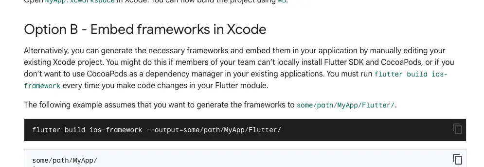 于是和之前的项目进行了对比后发现在/iOS/Flutter文件夹中缺少 了Flutter.xcframework 、App.xcframework 等文件,查看了一下flutter的官方文档后使用了方案B来重新生成Flutter.xcframework和App.xcframework文件.