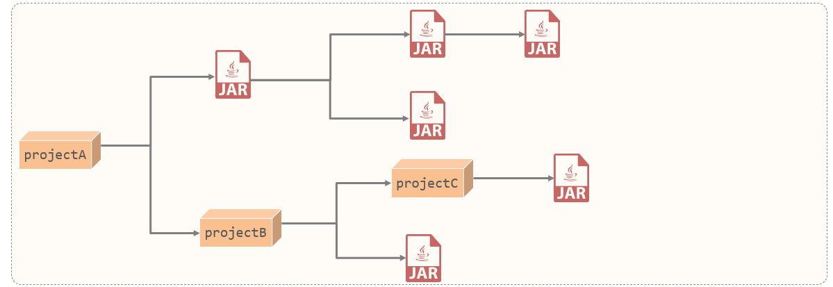 - 而projectB依赖了projectC及其他jar包。 那么此时,在projectA中也会将projectC的依赖传递下来。对于projectA 来说,projectC就是间接依赖。