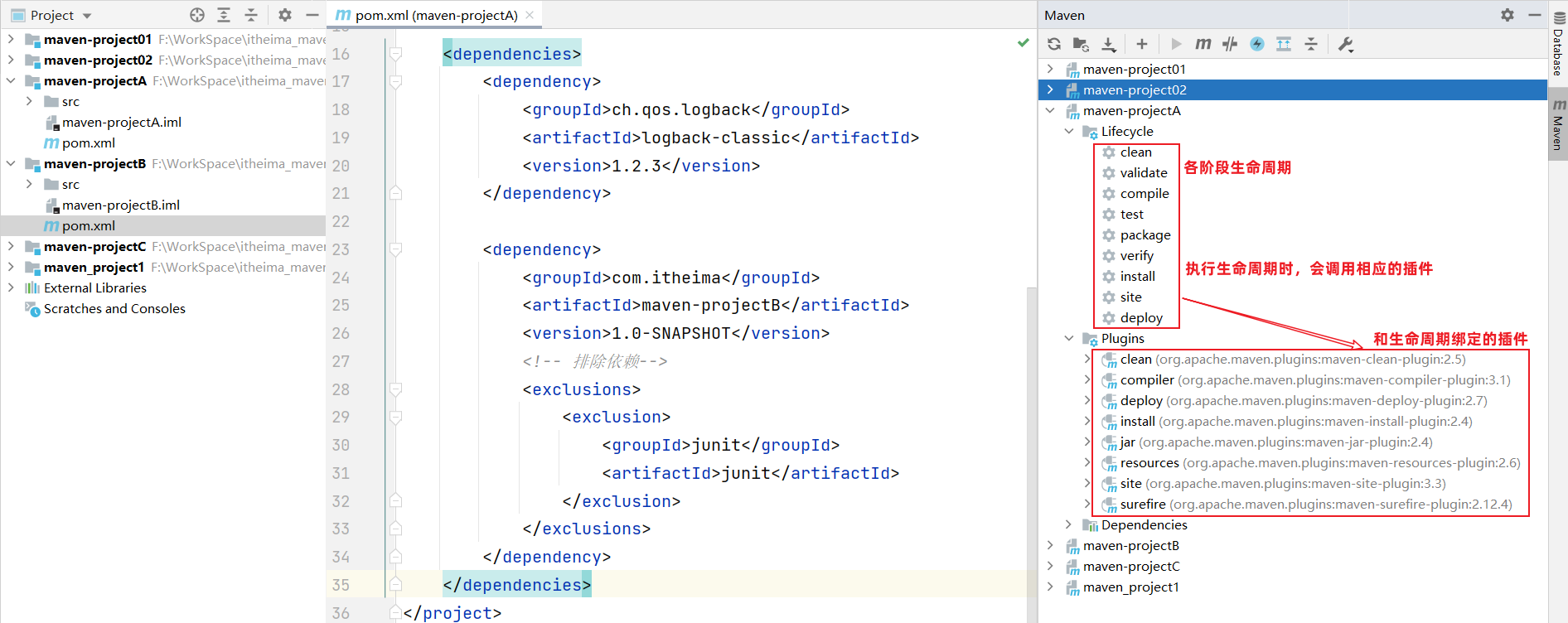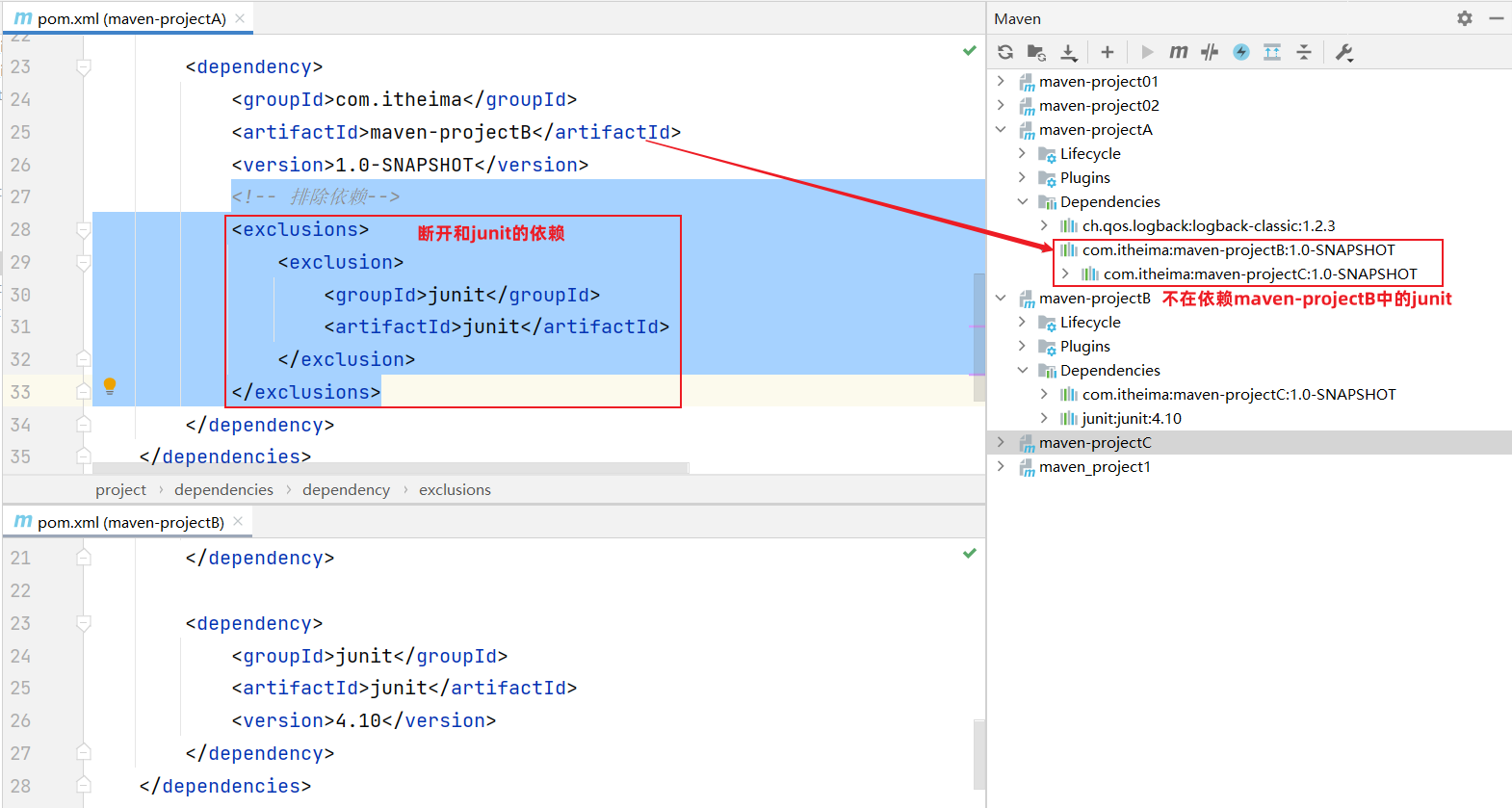 <dependency> <groupId>com.itheima</groupId> <artifactId>maven-projectB</artifactId> <version>1.0-SNAPSHOT</version></dependency><!--排除依赖, 主动断开依赖的资源--> <exclusions> <exclusion> <groupId>junit</groupId> <artifactId>junit</artifactId> </exclusion> </exclusions>