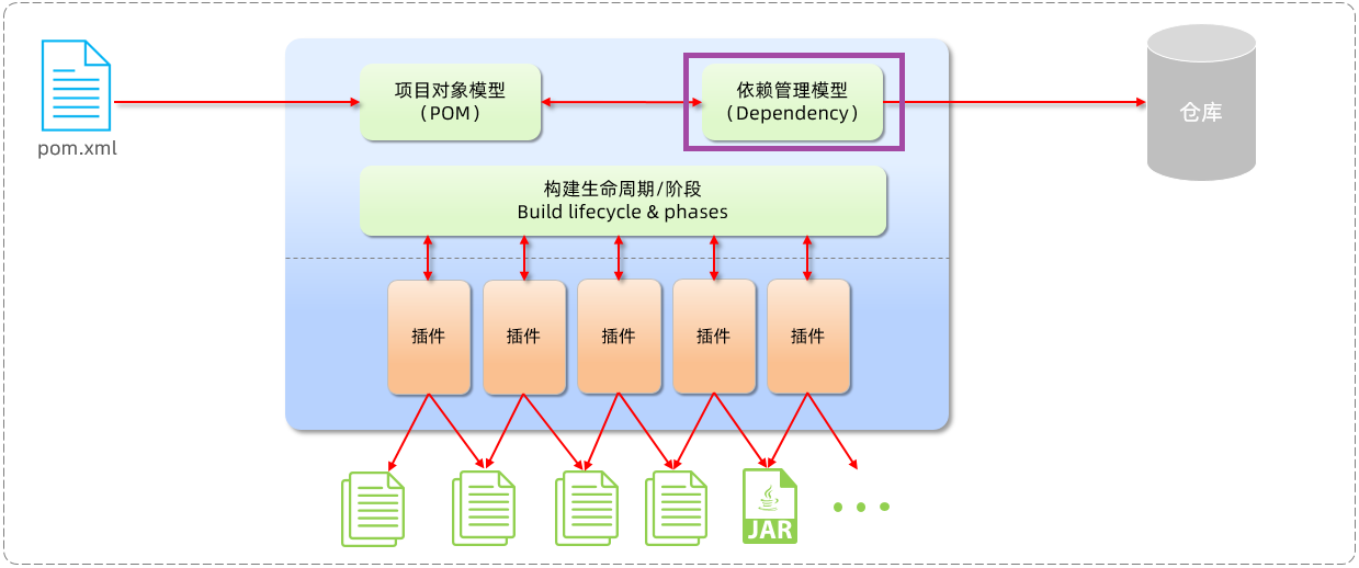 以上图中紫色框起来的部分属于依赖管理模型,是使用坐标来描述当前项目依赖哪些第三方jar包