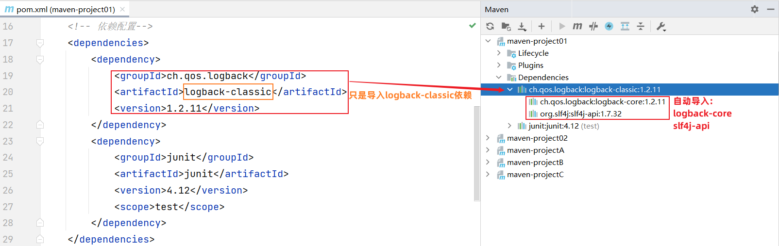 我们现在使用了maven,当项目中需要使用logback-classic时,只需要在pom.xml配置文件中,添加logback-classic的依赖坐标即可。