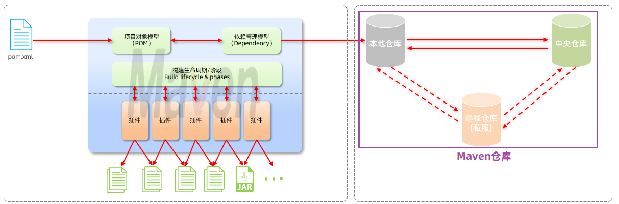 以上图中紫色框起来的部分,就是用来完成标准化构建流程 。当我们需要编译,Maven提供了一个编译插件供我们使用;当我们需要打包,Maven就提供了一个打包插件供我们使用等。