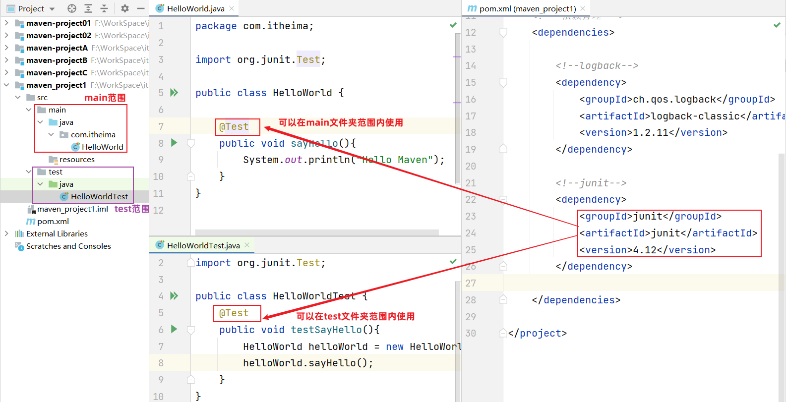 如上图所示,给junit依赖通过scope标签指定依赖的作用范围。 那么这个依赖就只能作用在测试环境,其他环境下不能使用。