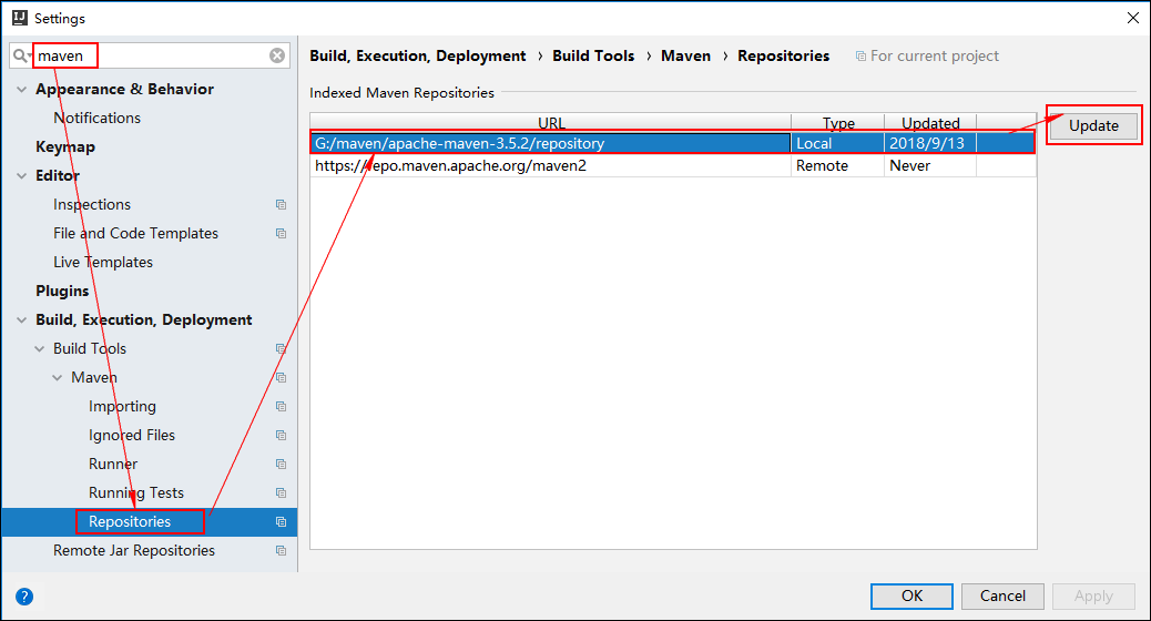 打开设置----搜索maven----Repositories----选中本地仓库-----点击Update