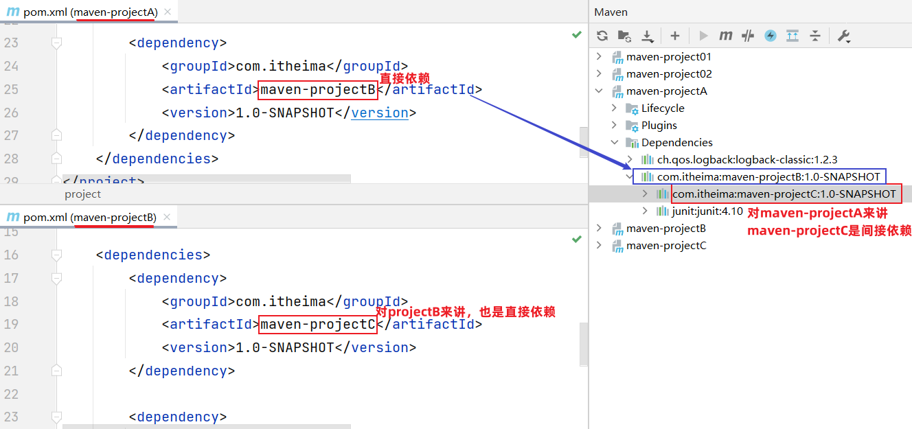 - projectA依赖了projectB。对于projectA 来说,projectB 就是直接依赖。