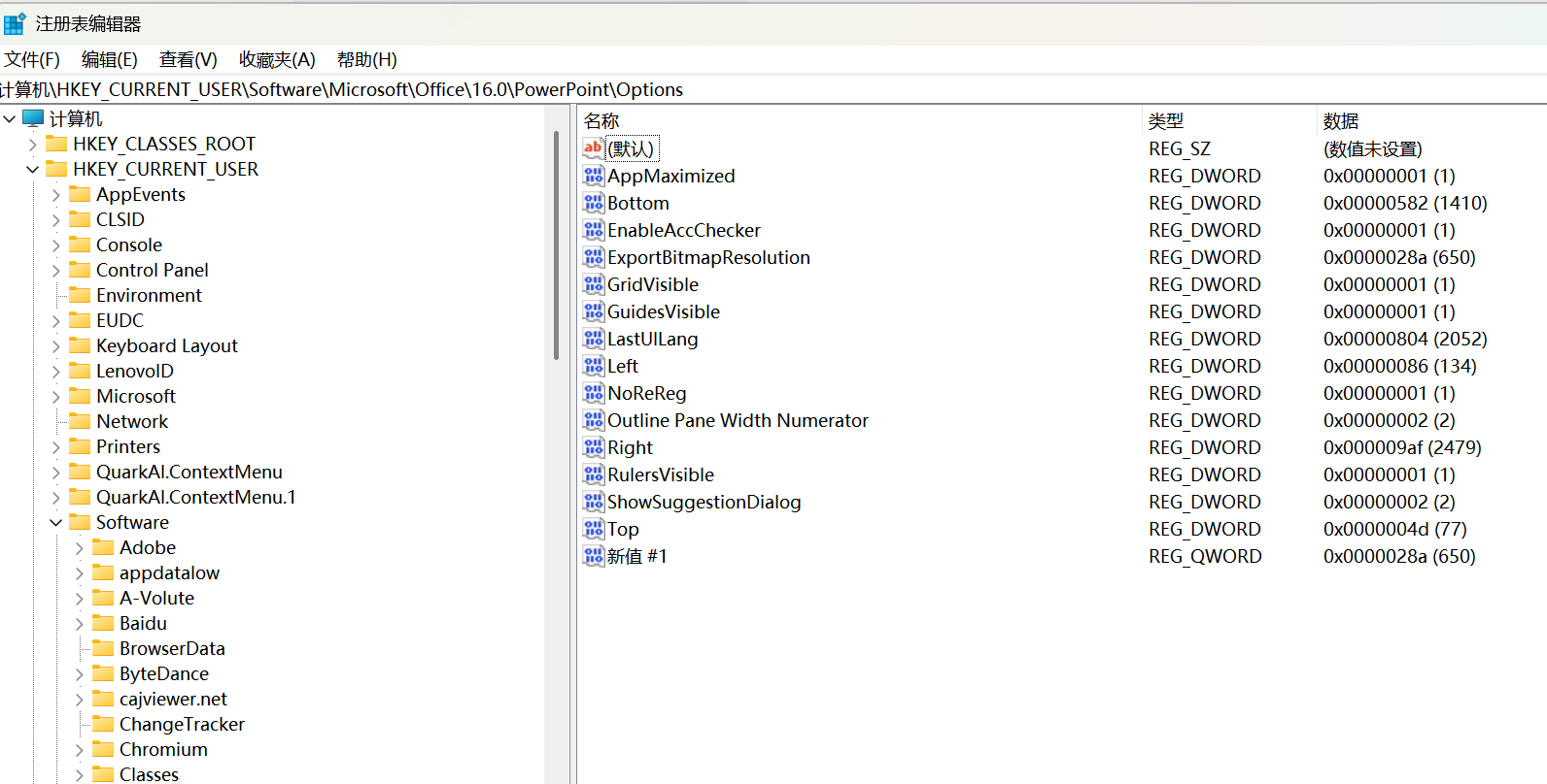 (2)找到计算机\HKEY_CURRENT_USER\Software\Microsoft\Office\16.0\PowerPoint\Options