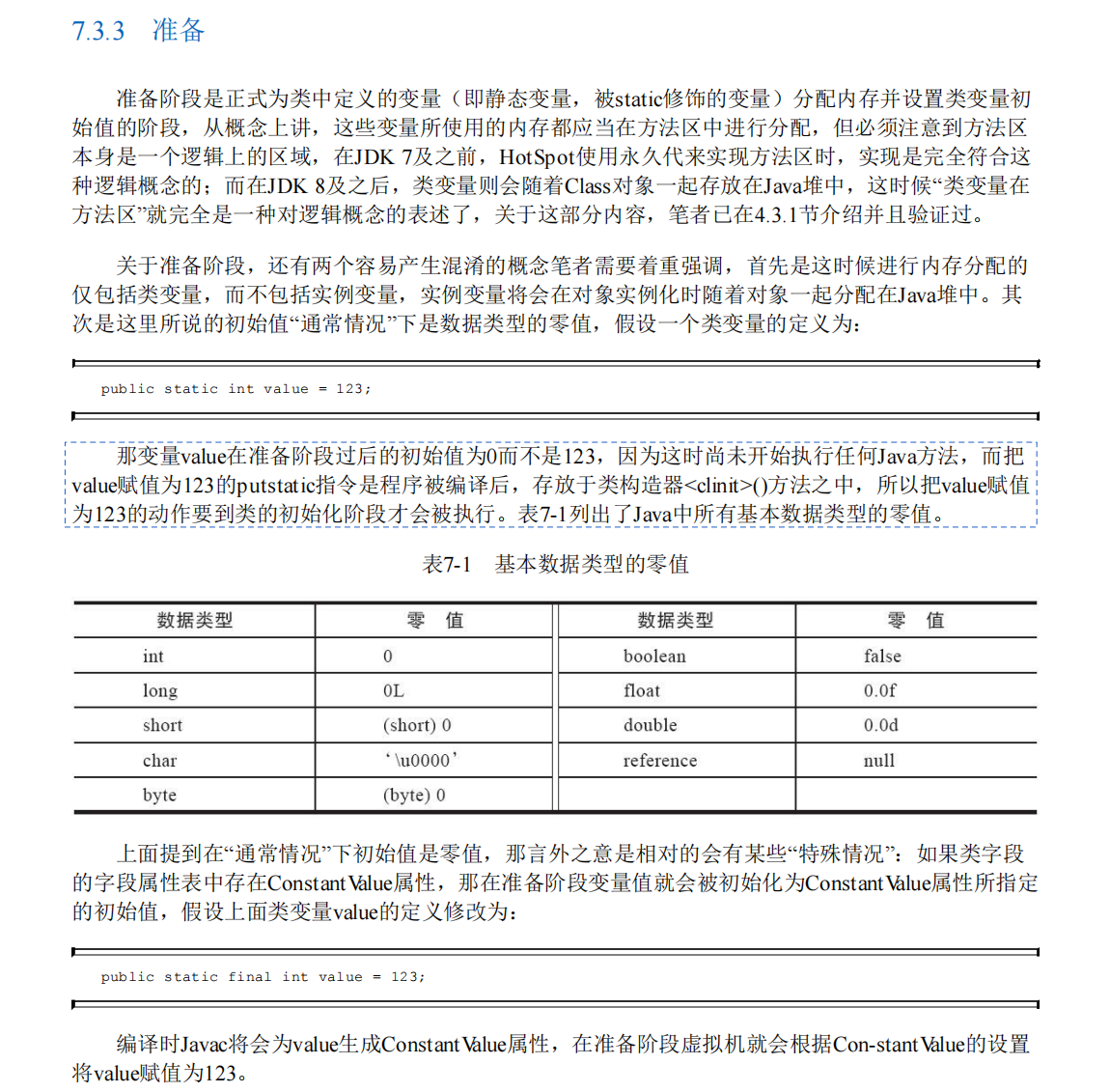 final修饰(如public static final int value = 123),那么在准备阶段就会直接将其初始化为指定的值123,而不是零值。