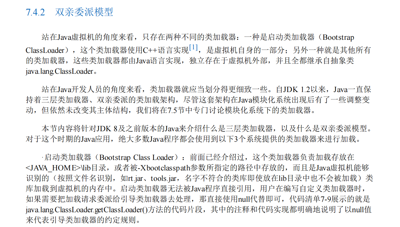 <JAVA_HOME>/lib目录或-Xbootclasspath指定路径中、能被虚拟机识别的类库(如 rt.jar);无法被 Java 程序直接引用,自定义类加载器委派给它时用null表示。 -