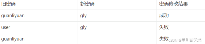 这个功能的设置也是出于对系统的保护,让操作人员的密码可以一直变化,减少泄露的几率。测试的数据见下表。通过验证旧密码,确认操作者是本人,然后开始对新密码进行登记。一般修改完密码后,需要再次登录