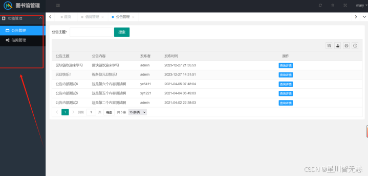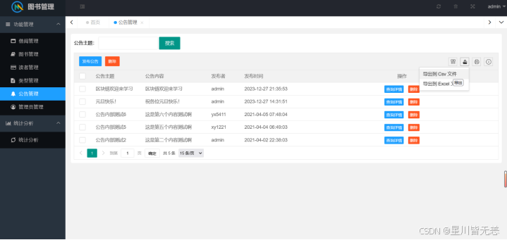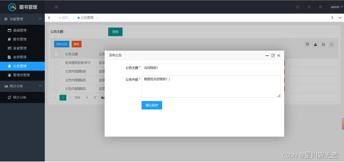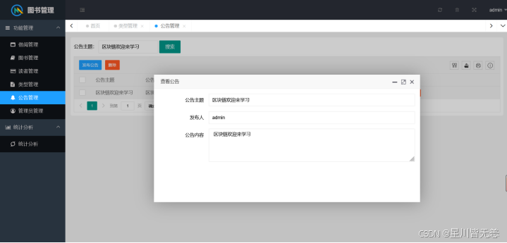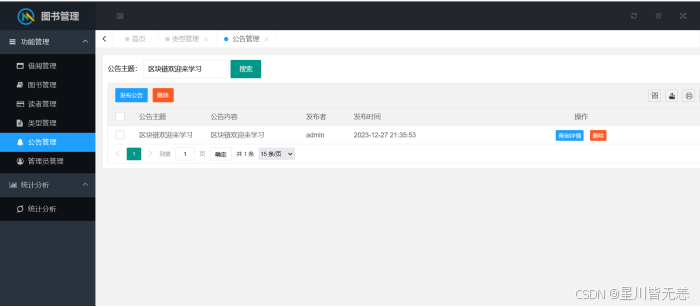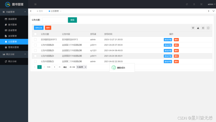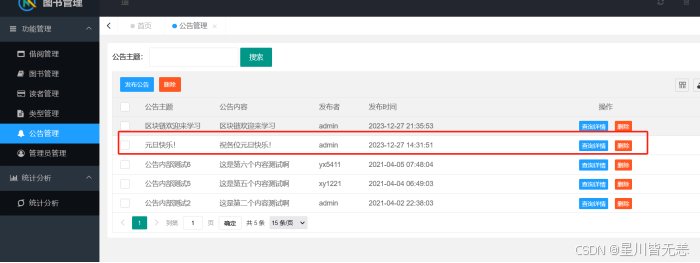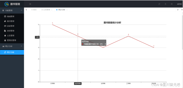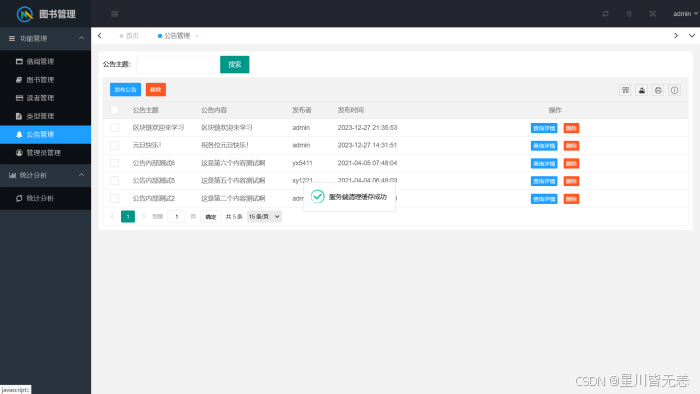 测试结果表明,本系统完全满足预设的功能与性能需求,实现了用户认证、图书管理、借阅管理、用户管理、公告管理及数据可视化分析等核心功能,界面友好、操作便捷,能够有效减轻图书管理员的工作负担,提升图书馆管理效率,为读者提供更优质的借阅服务。同时,系统具备良好的安全性与稳定性,可24小时不间断运行,能适应图书馆的日常管理场景。