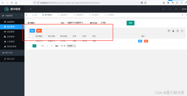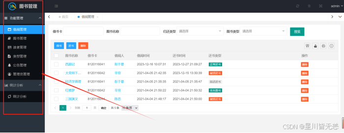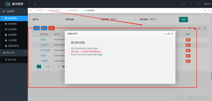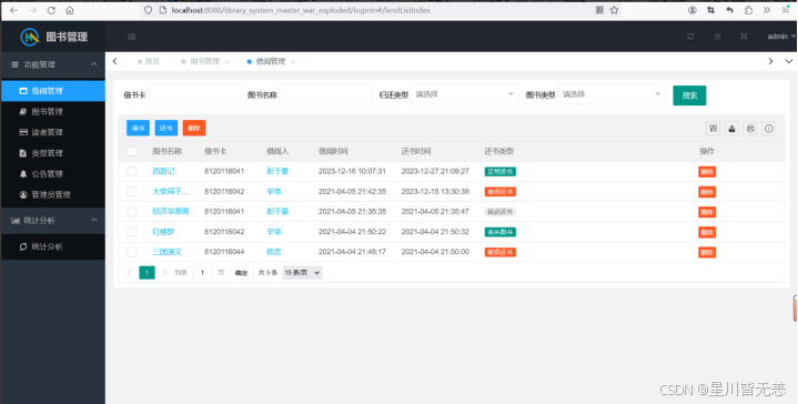 6.系统提供管理员的借阅管理借书、还书、删除等功能,还包括对所有书籍信息的条件查询。