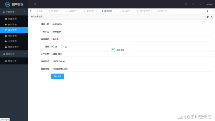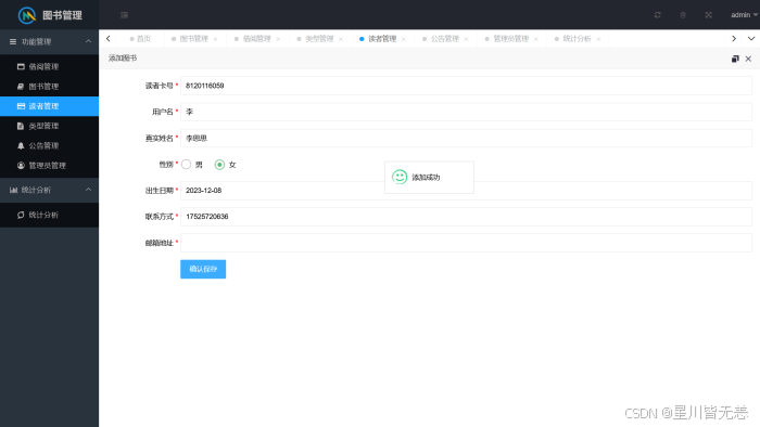 综上所述,本系统成功实现了传统图书馆管理模式的数字化转型,达到了预期的研究目标,具有较强的实用性与应用价值。但系统仍存在一定不足,如功能拓展性有待提升、智能推荐功能缺失等。未来可进一步优化系统性能,拓展移动端访问、图书智能推荐等功能,完善数据可视化分析维度,使其更贴合图书馆管理的多元化需求,为图书馆事业的数字化发展提供更有力的支撑。