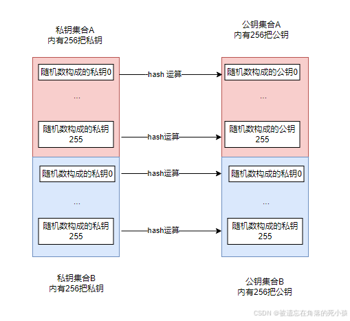 这两个集合中含有的随机数就是我们Lamport 算法的私钥,而公钥则是私钥通过hash 运算而来。因此两个私钥集合就会得到对应的两个公钥集合