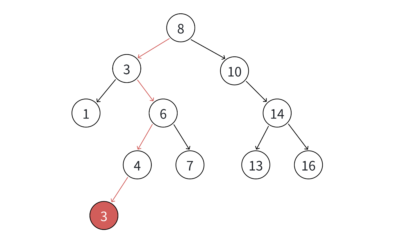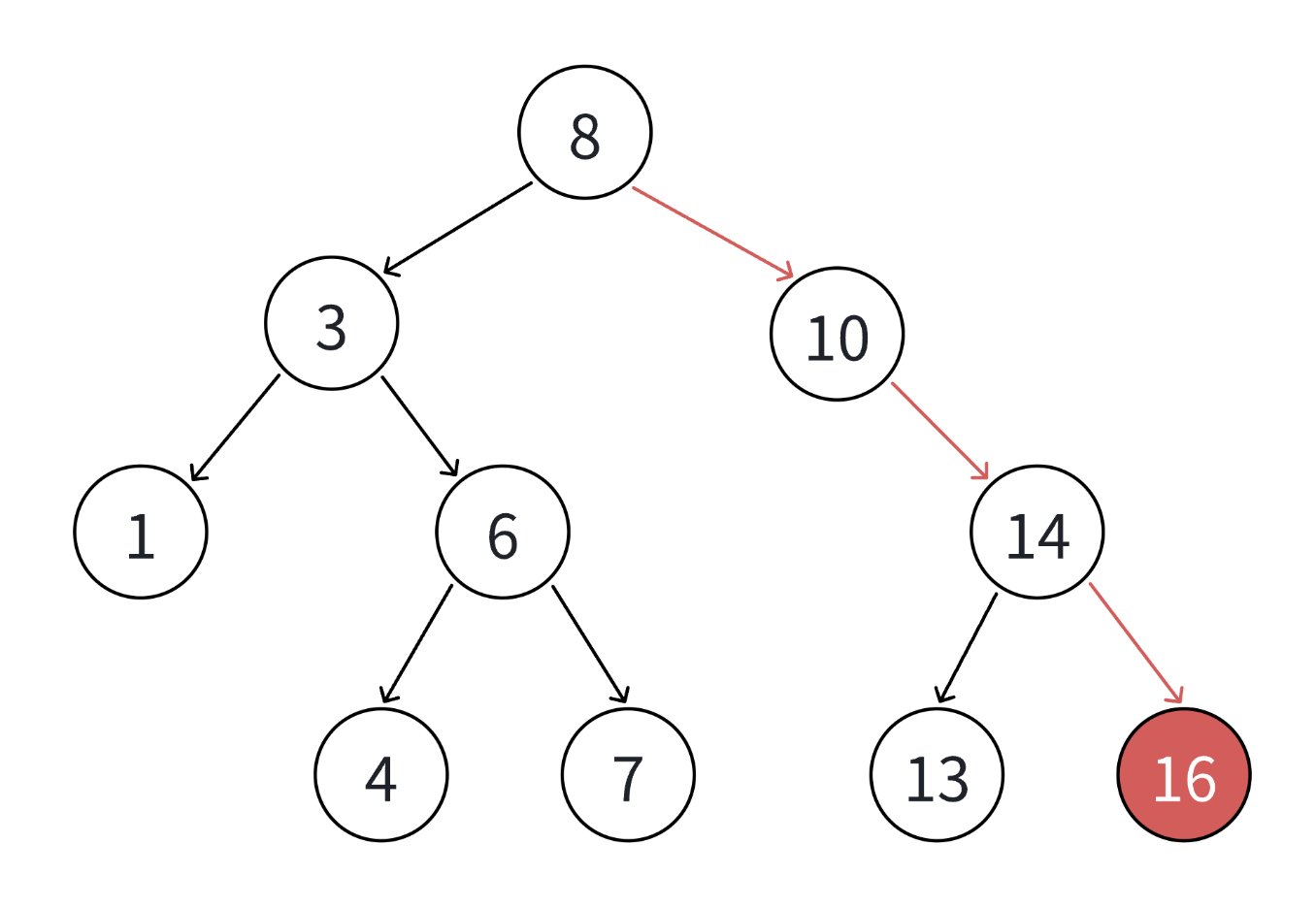 - 从根节点开始比较:查找值大于根节点则向右查找,小于则向左查找;