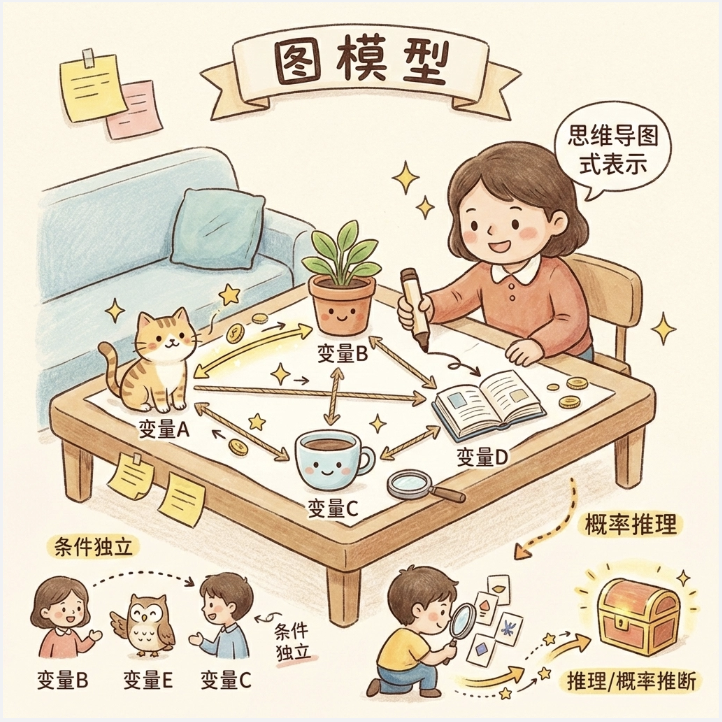 图模型主要分两类:有向图(贝叶斯网络) 和无向图(马尔科夫随机场),是处理不确定性推理的核心工具(比如语音识别、疾病诊断)。