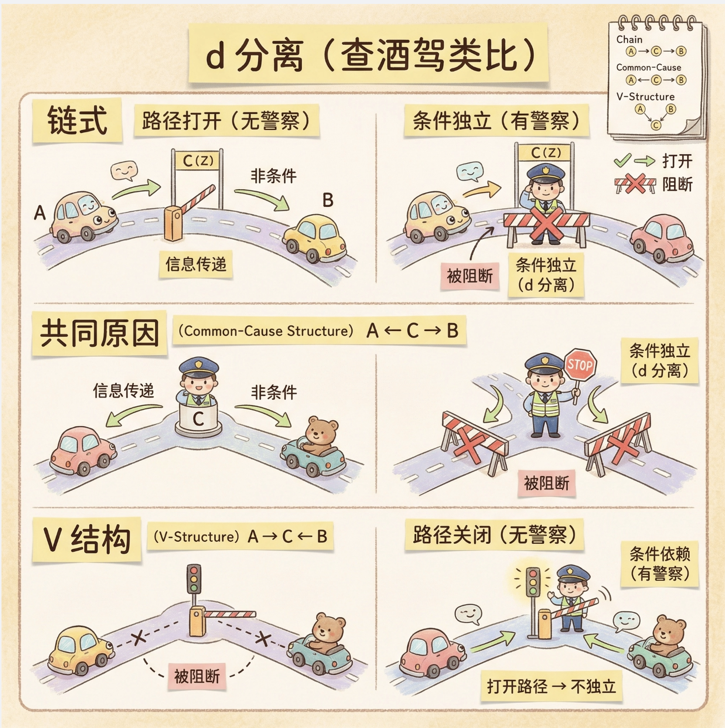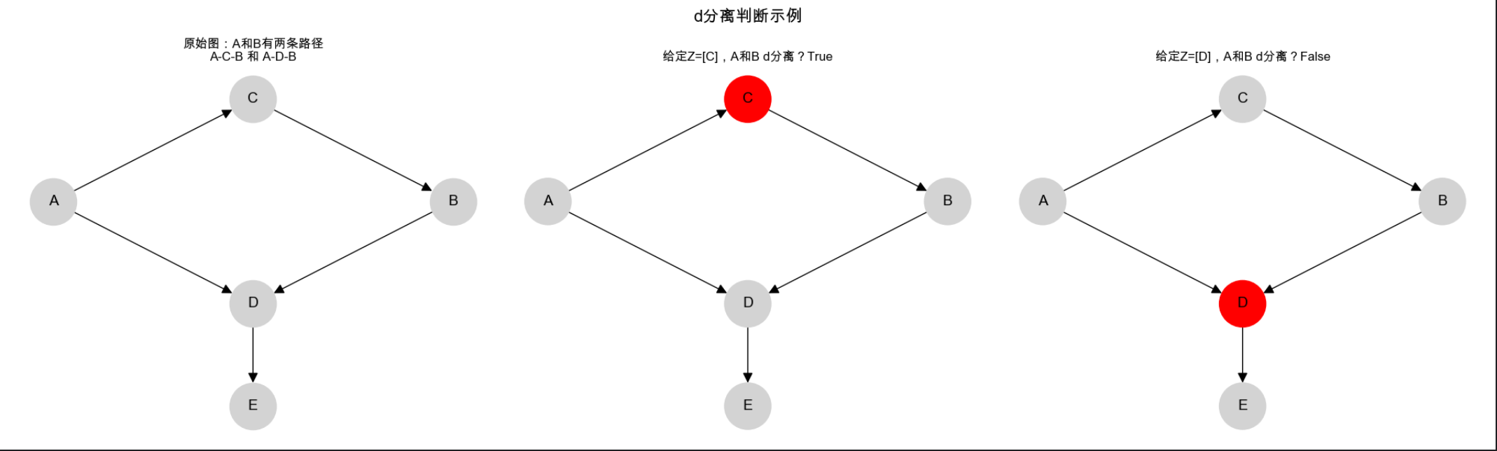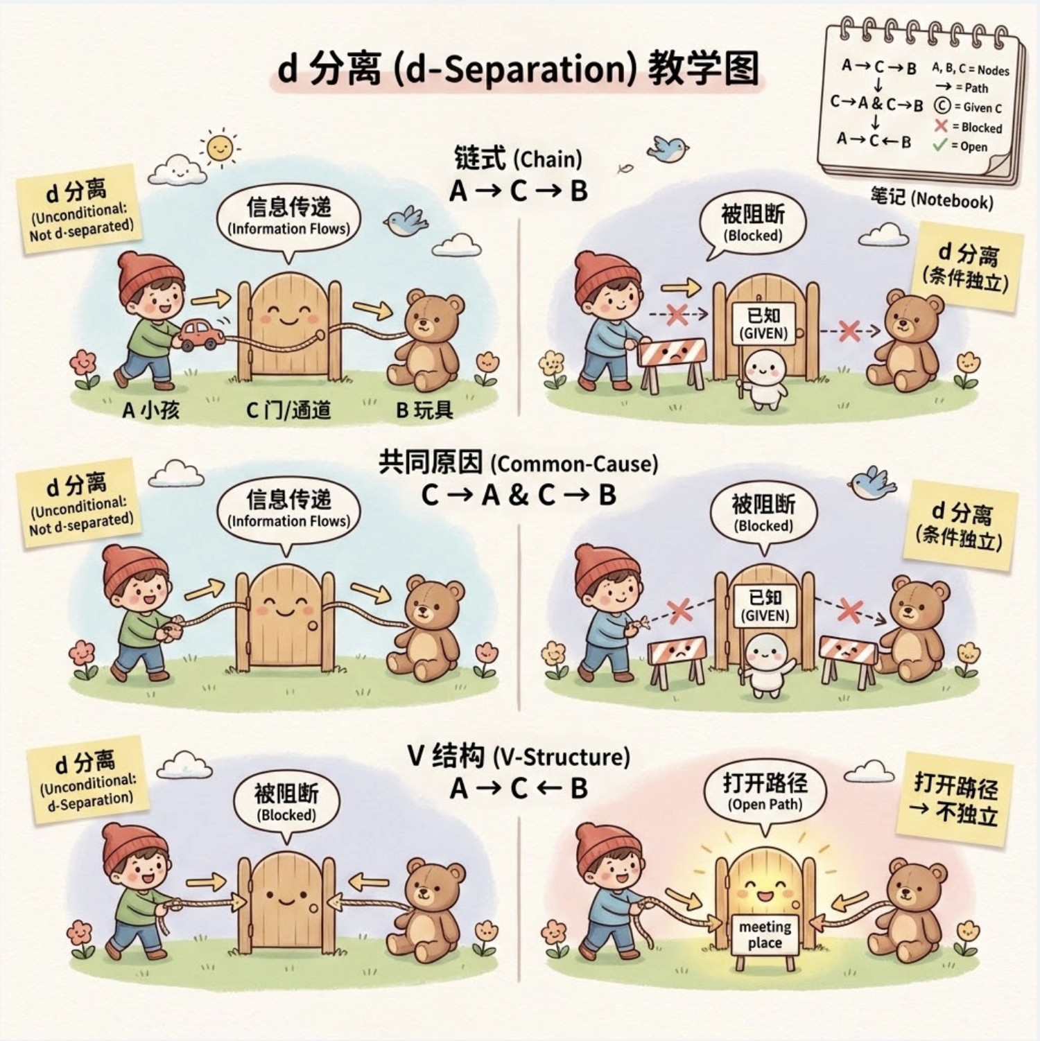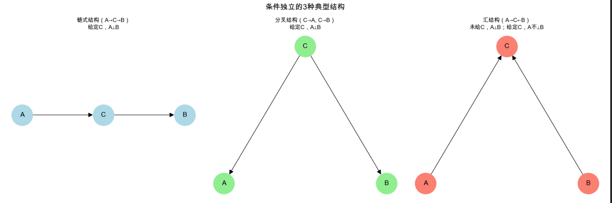 - 可视化图:3 个子图分别展示链式、分叉、汇结构,标注条件独立特性;