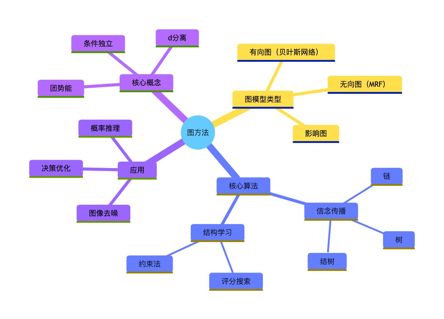 1.图方法的核心是 "用图形表示变量间的依赖 / 独立关系",有向图(贝叶斯网络)和无向图(MRF)是两大核心类型;