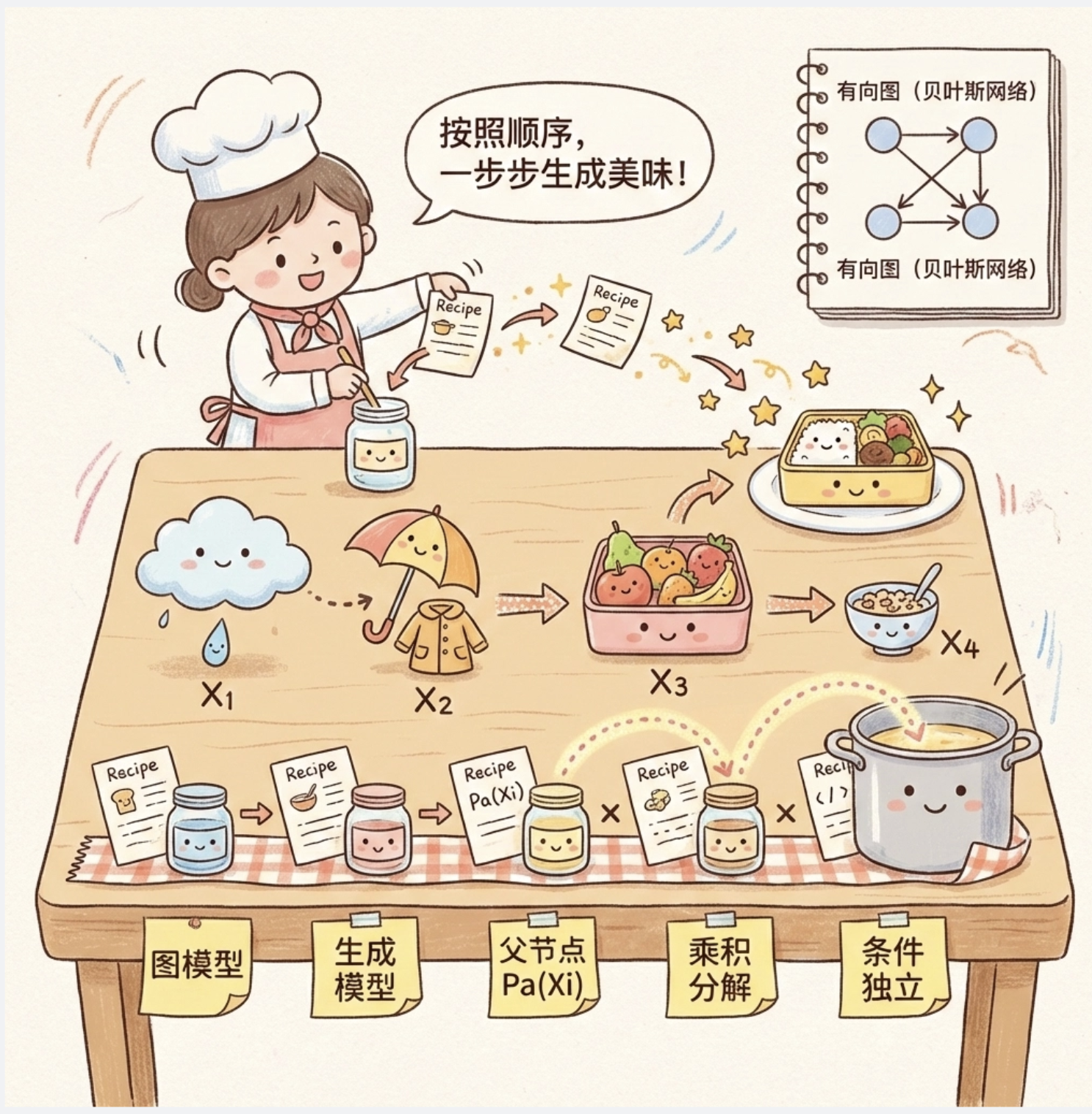 图模型的生成模型,核心是 "通过图结构的条件独立特性,分解联合概率分布,从而高效生成样本"。