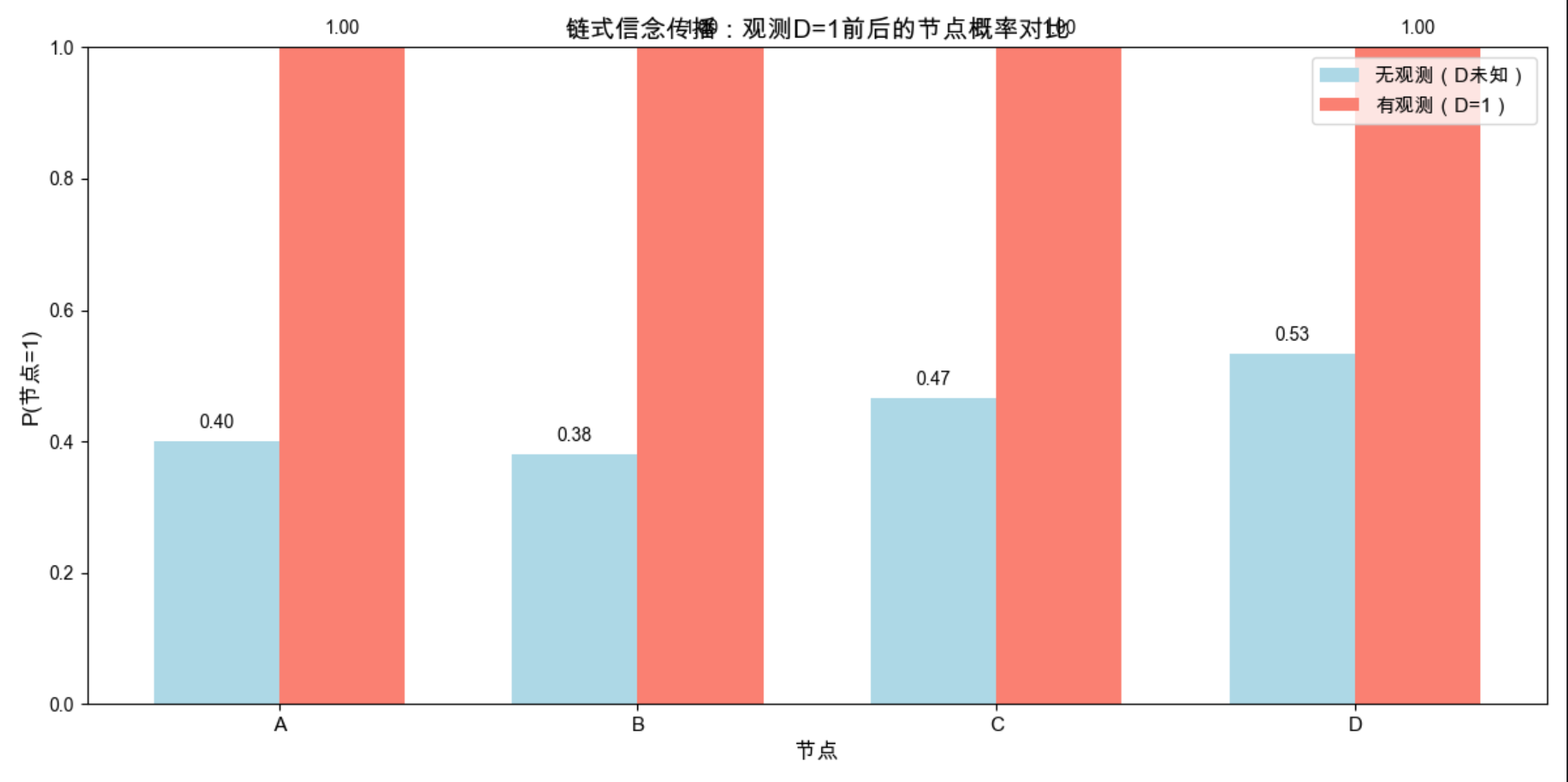 - 修改链式信念传播代码,观测 B=1,计算 A、C、D 的后验概率;