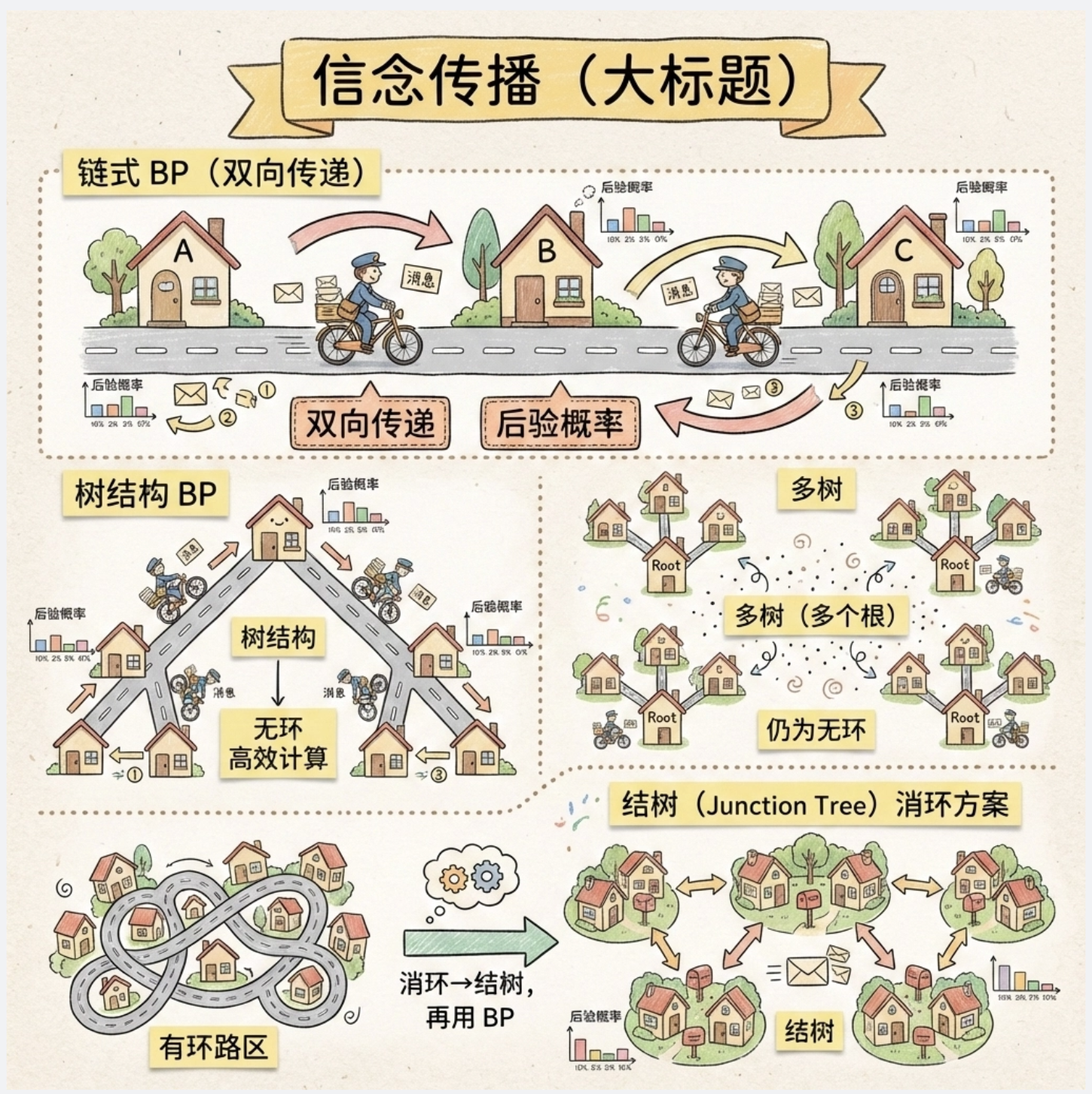 2.条件独立和 d 分离是判断变量关系的基础,信念传播是图模型推理的核心算法;