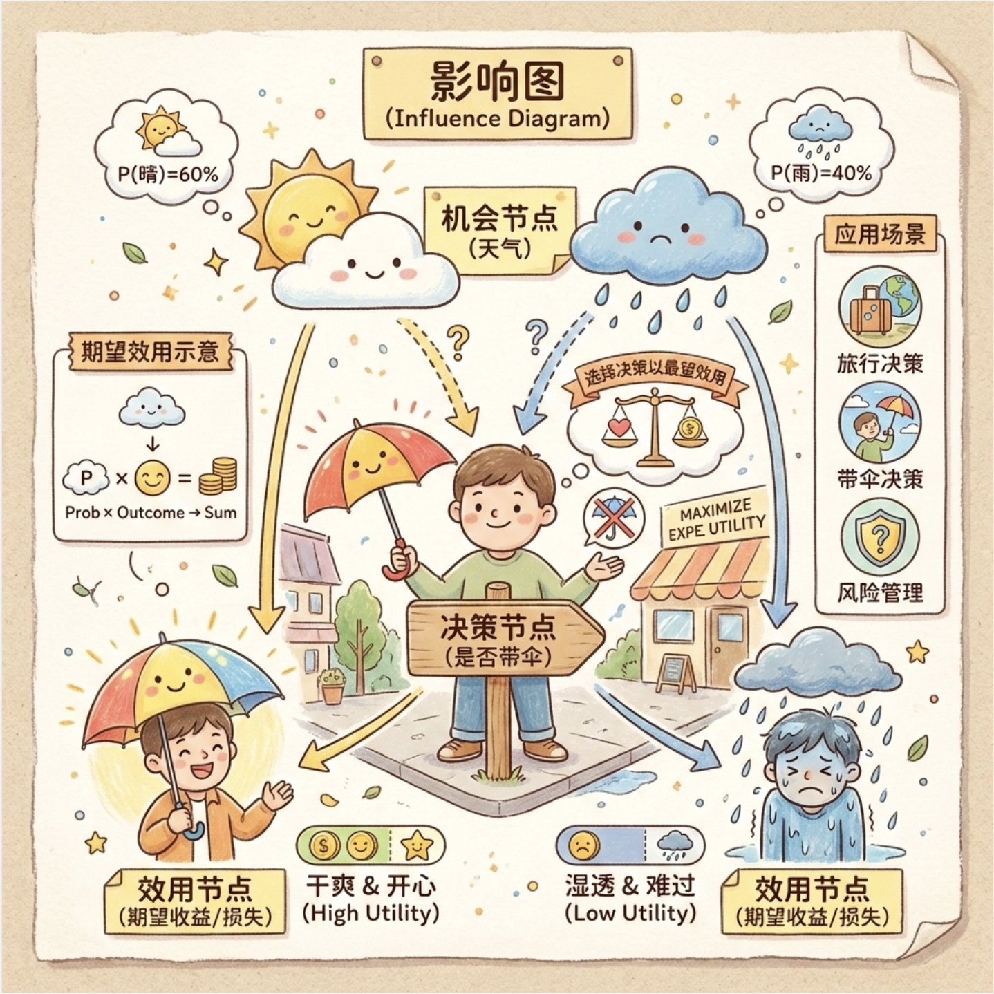 影响图是 "带决策节点和效用节点的图模型",核心是 "在不确定性下做最优决策"。