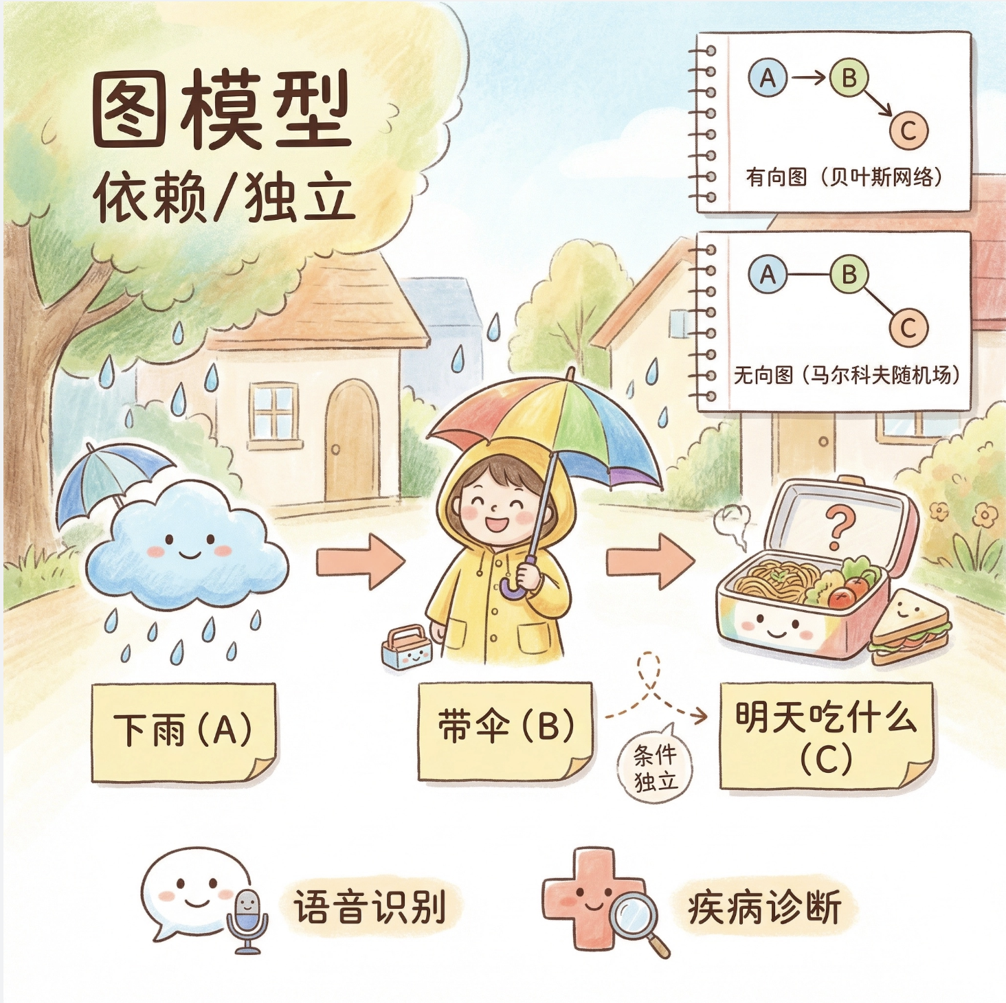 你今天是否 "下雨"(节点 A)会影响是否 "带伞"(节点 B),但不会影响 "明天吃什么"(节点 C)------ 这种依赖 / 独立关系,用图能一眼看明白。