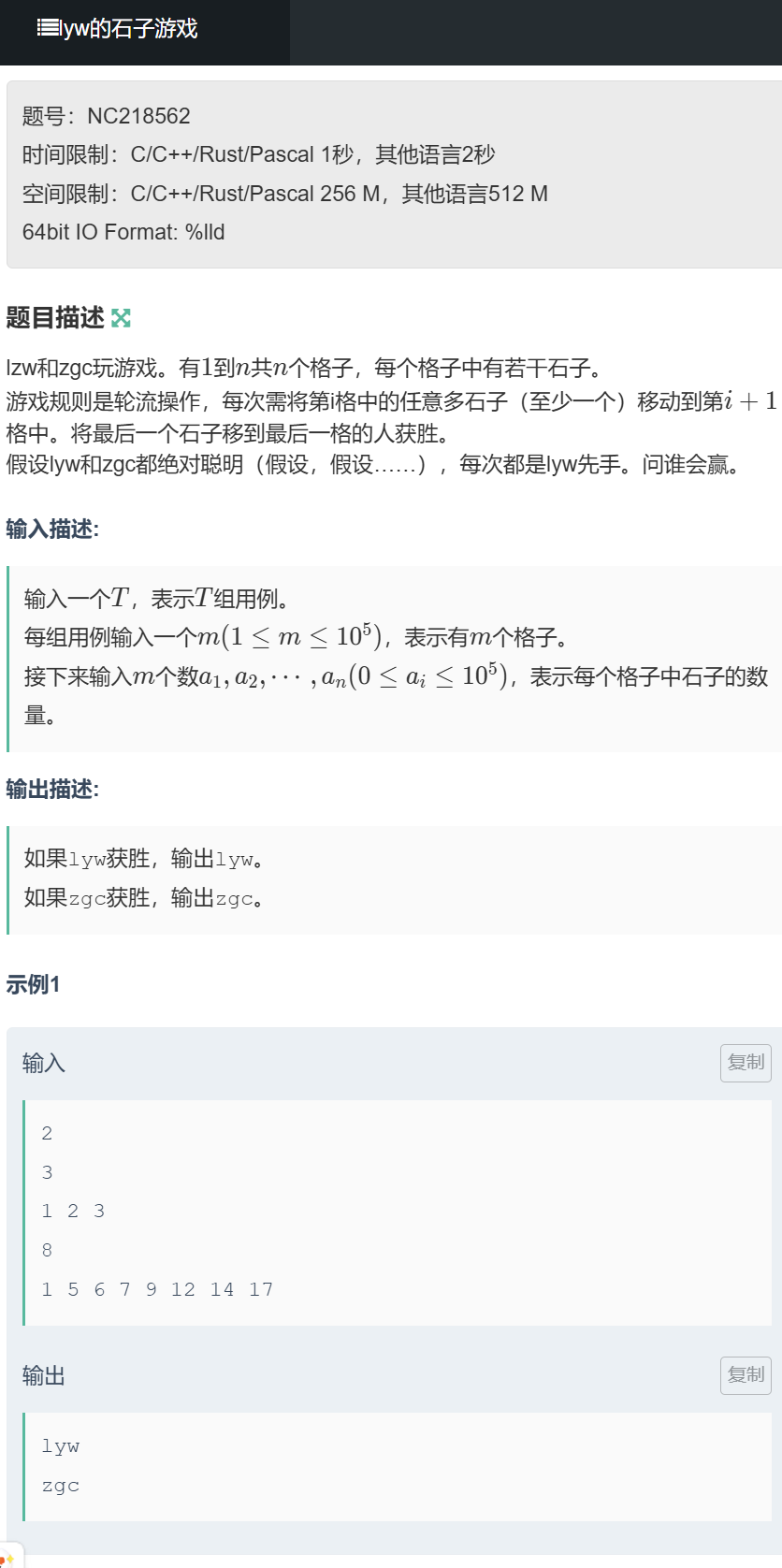 有 1~n 个格子,每个格子中有若干石子;两名玩家轮流操作,每次将第 i 格中的任意数量石子(至少 1 颗)移动到第 i+1 格 ;将最后一颗石子移到最后一格的玩家获胜。lyw 为先手,问谁会赢?