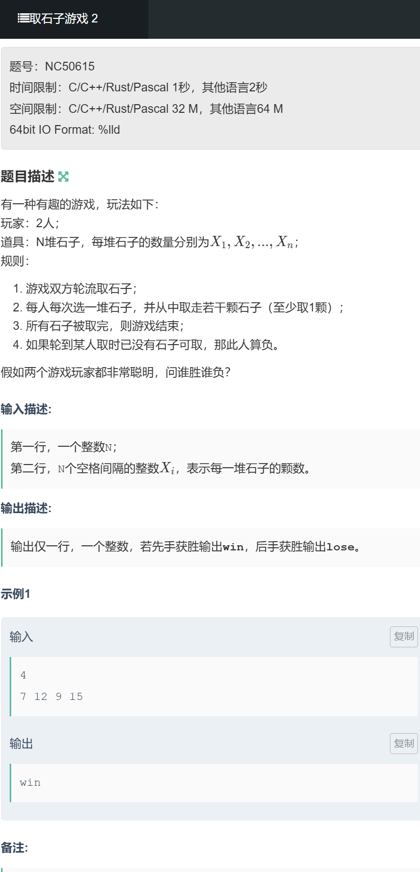 3.1 例题 1:取石子游戏 2(Nim 博弈基础模板题)
