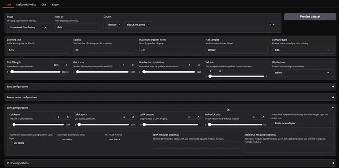 llamafactory-cli webui启动它,这会打开一个基于Gradio的本地Web界面。这个UI显著降低了门槛,也就是说,你可以完全不编写任何代码就微调模型。训练完成后,评估/聊天标签让你在浏览器中测试模型的性能,导出标签让你打包结果模型(可以选择合并LoRA权重、将模型量化为GGUF/AWQ等,并推送到Hub或本地保存)。