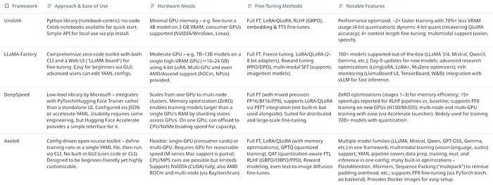 在实践中,使用Unsloth的一个权衡是它为你抽象了很多东西,这对于易用性很好,但意味着与Axolotl等框架相比,对训练循环的手动控制较少。